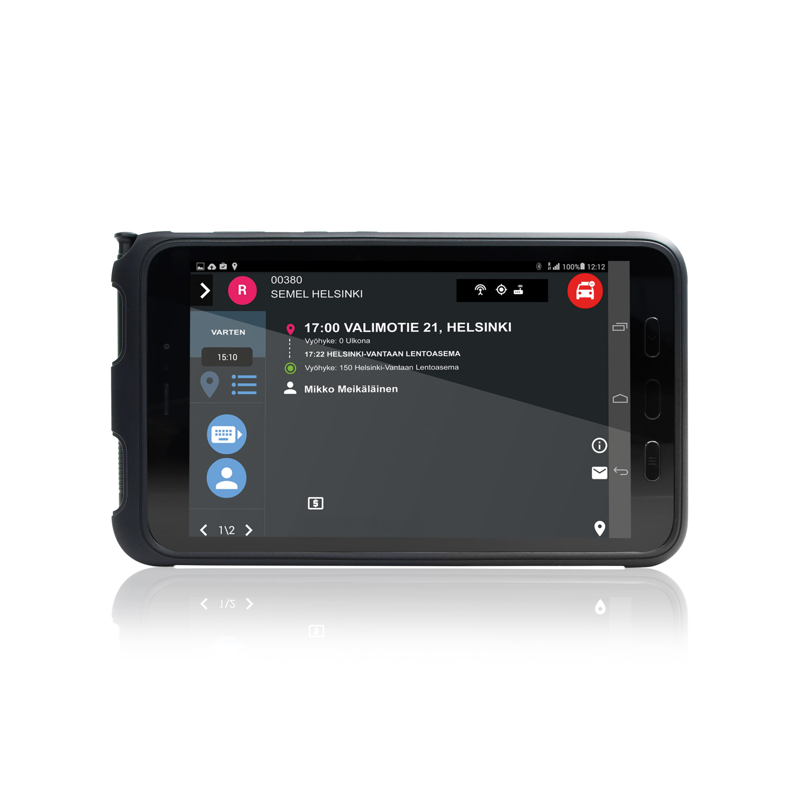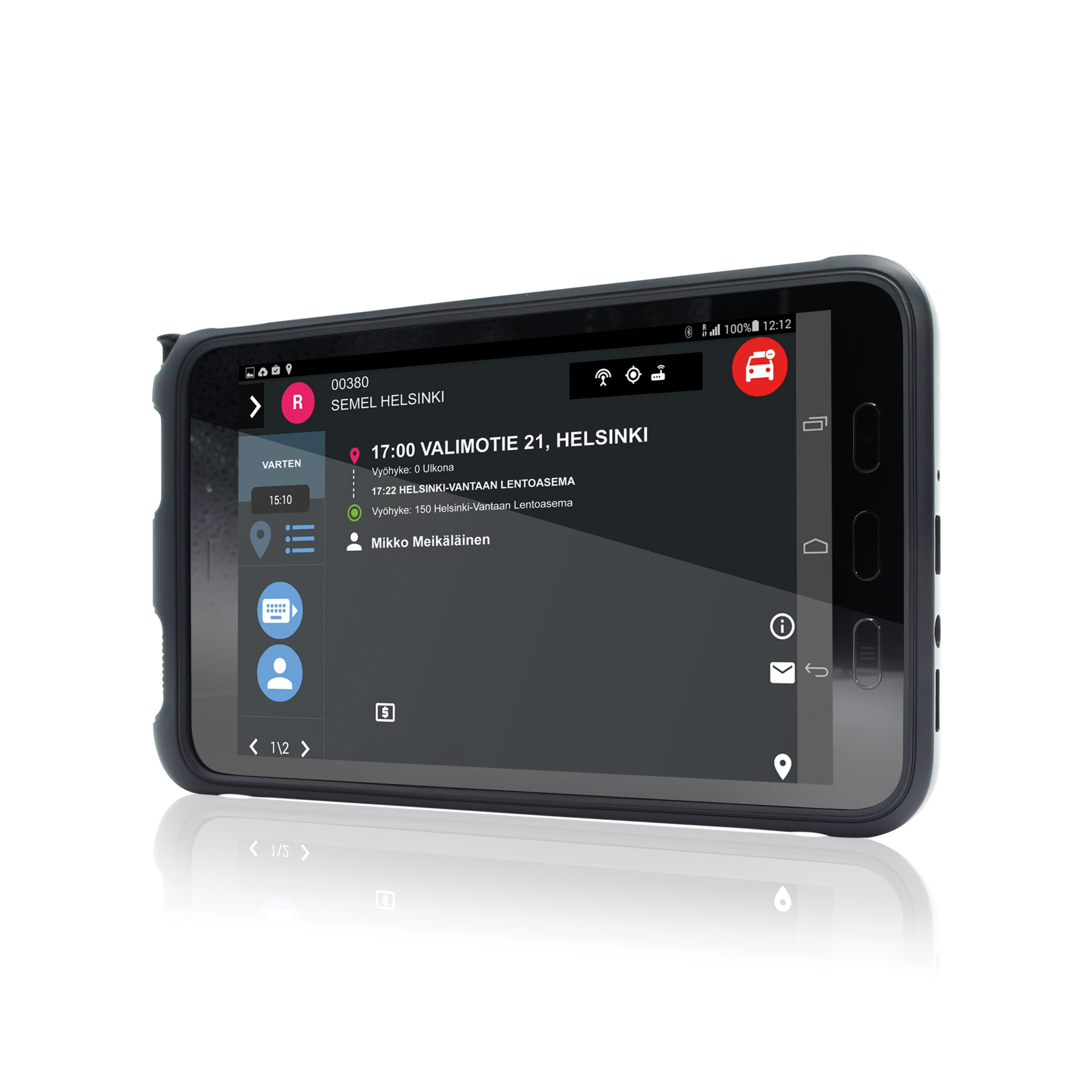 Samsung Galaxy Tab Active5 tabletti 8 tuuman näytöllä, lataavalla Brodit autotelineellä ja Semel Contact ajovälitysohjelmalla.